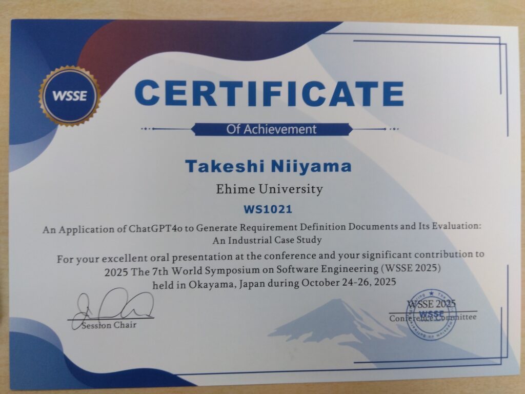 国際会議発表(WSSE2025) 投稿日2025年10月25日2025年10月25日投稿者metrics English D3 の新山さんが岡山大学で開催された国際会議 The 7th World Symposium on Software Engineering (WSSE2025) に参加し,研究発表を行いました.