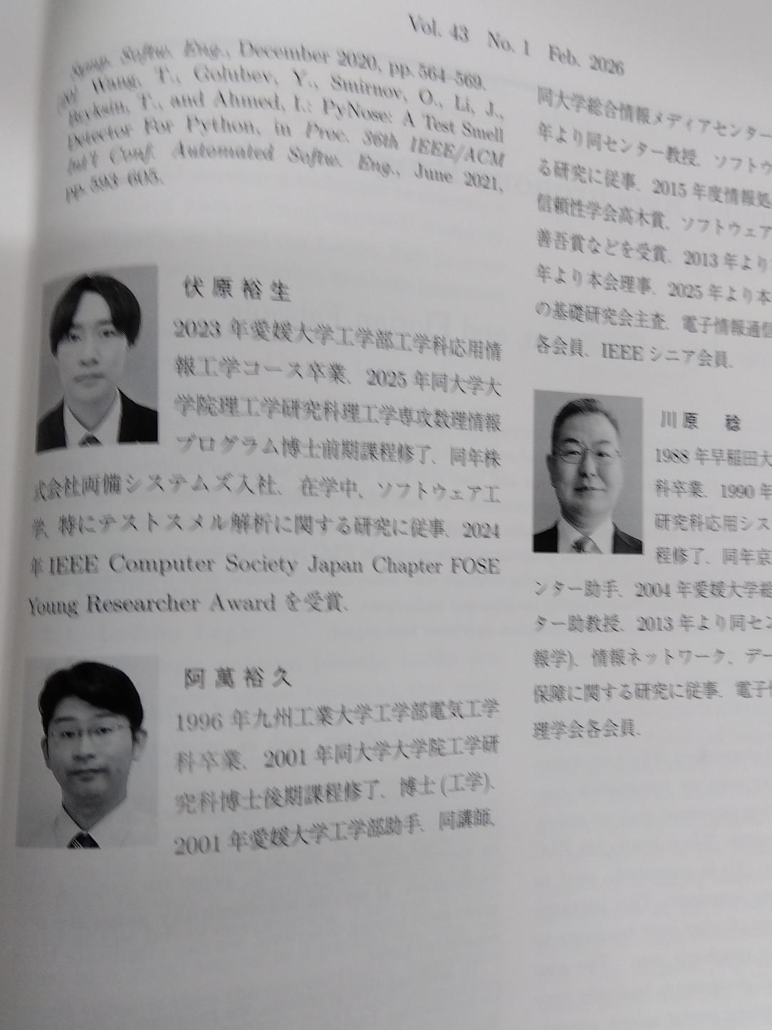2024年度大学院修了生・伏原君の論文「Python テストスメルが被テストコードのバグ潜在性に及ぼす影響に関する定量分析」が日本ソフトウェア科学誌「コンピュータソフトウェア」に掲載されました.